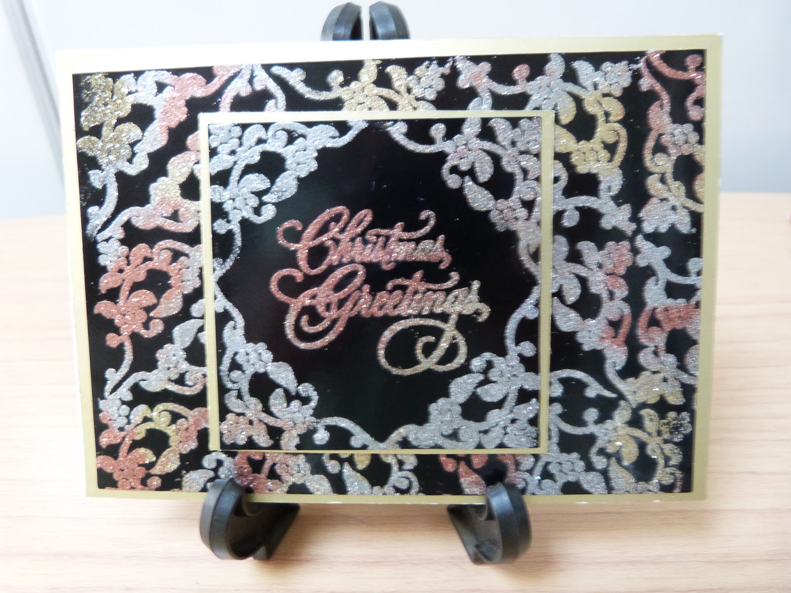 Honeydoo glitter embossing powder in bronze, gold and silver and backed onto mat gold card. I did the same again with the Christmas greeting on a small square piece of coated card and matted this onto another square of gold mat card.